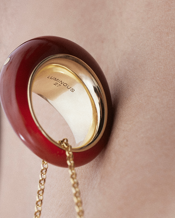 Named after the gentle French cooking technique, the Bain de Marie Grande ring is our most iconic item. This bombé-shaped solid semi-precious stone ring is hand-carved with the highest attention to detail. Embellished with an 18K gold interior coating, this elegant piece features an 18K gold drop.