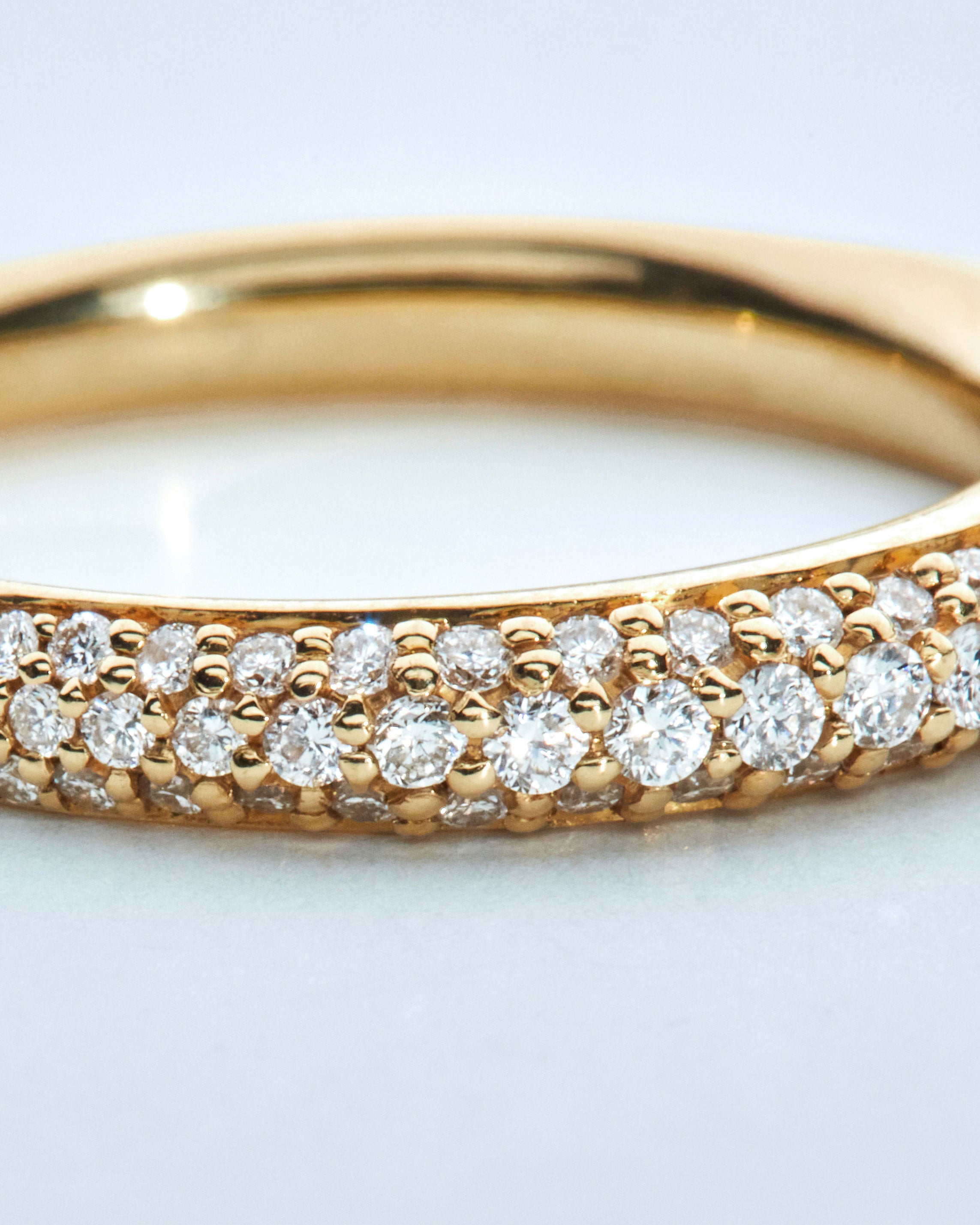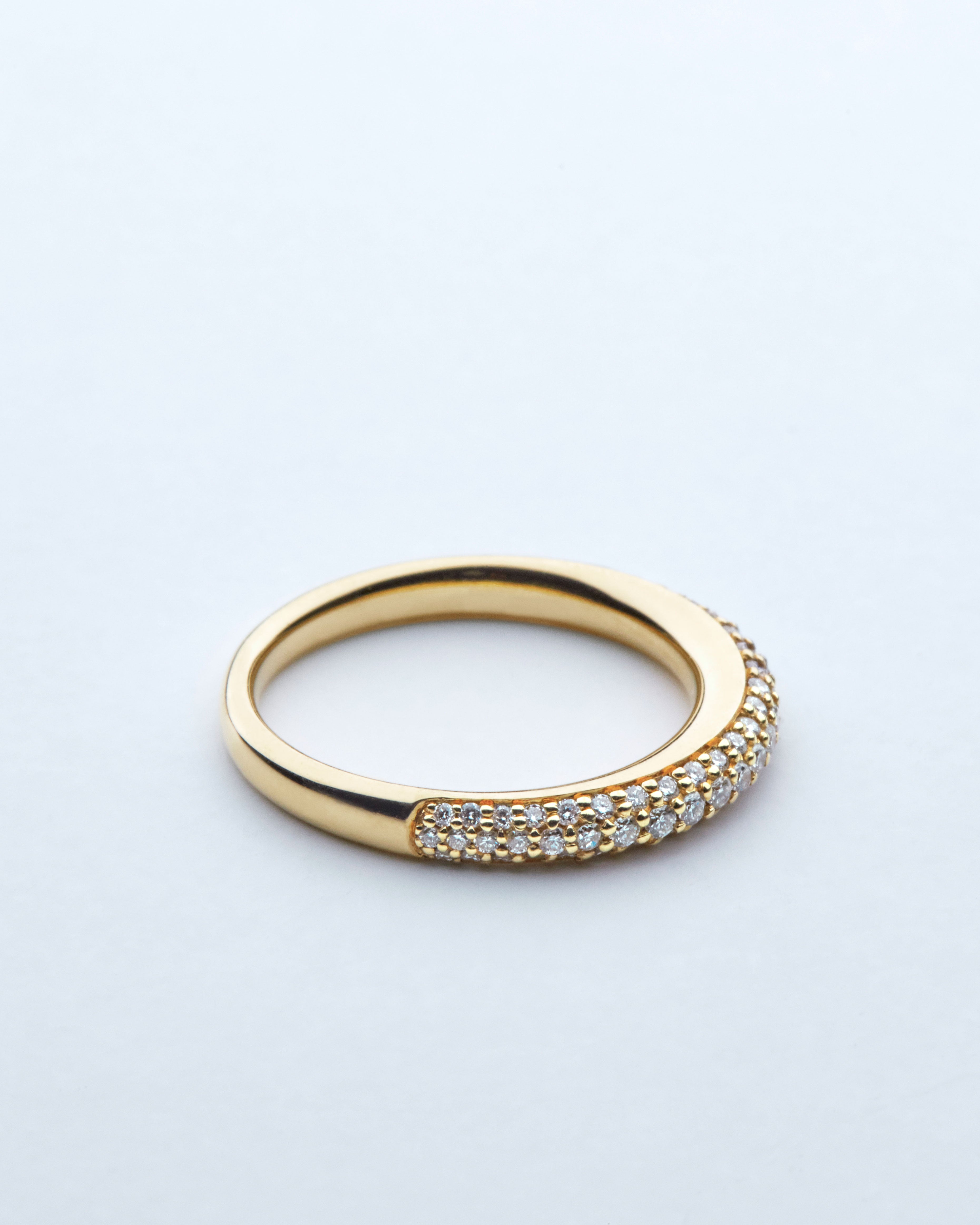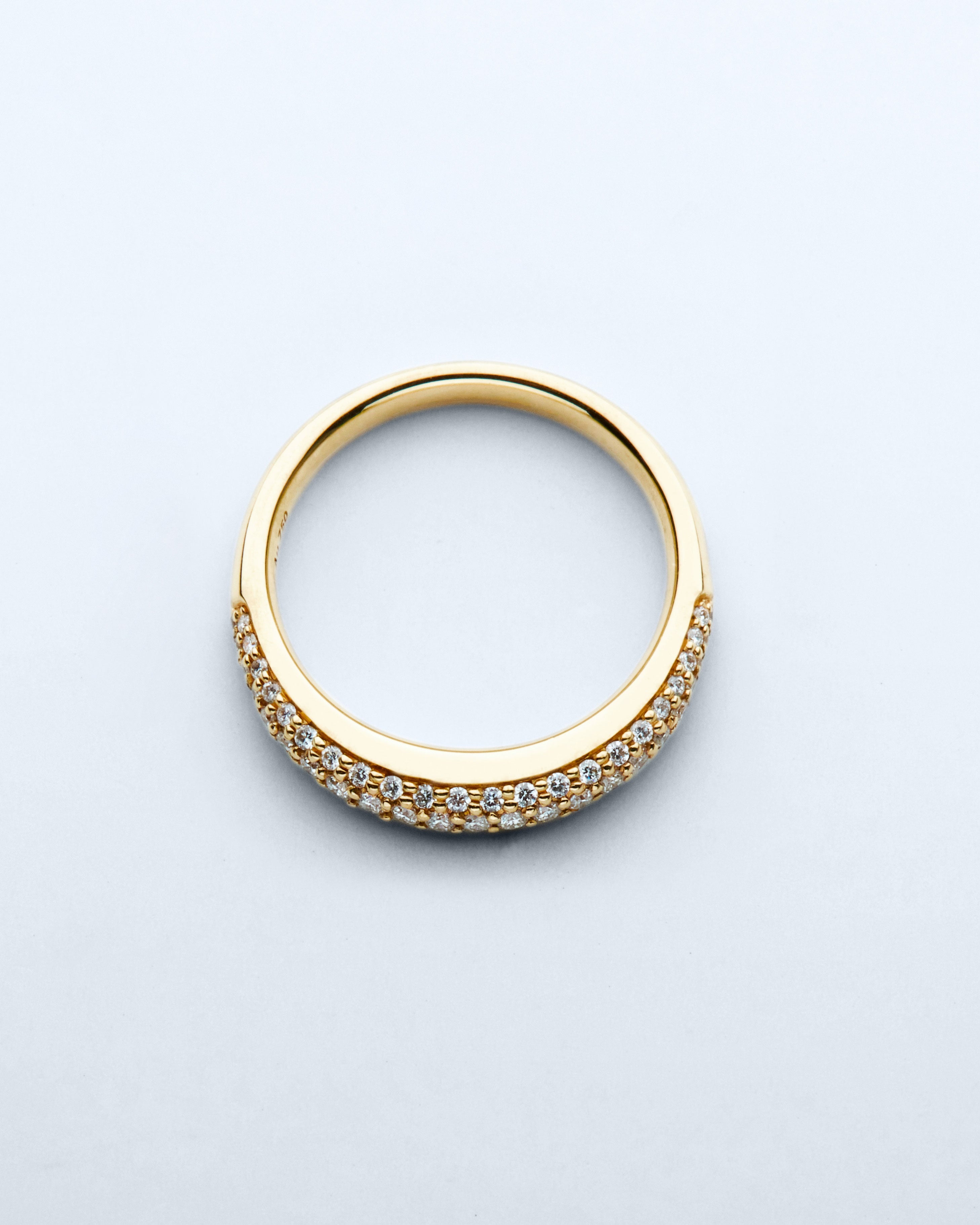 Inspired by Caracas’s festive nights at 27 degrees. Our classic, small-sized bombé-shaped solid gold band exhibits an elegant set of diamonds in three rows spanning half of the band. Celebrate everyday with this timeless diamond and 18K gold essential piece. Designed to stack with other bombe shapes or to be worn as a single piece.