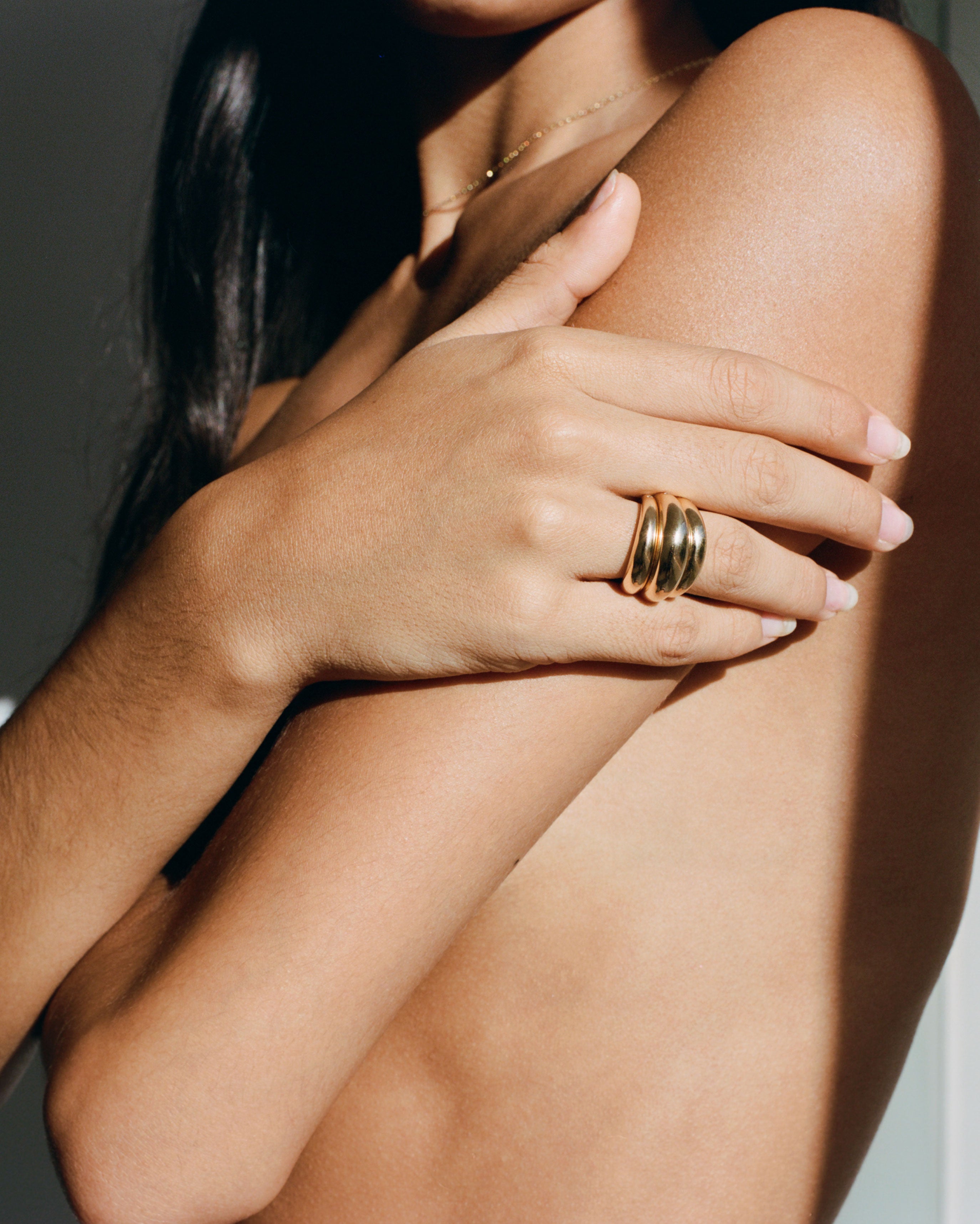 The model wears two Eduardo Chiquito Rings stacked with an Eduardo Mediano Ring in the middle.