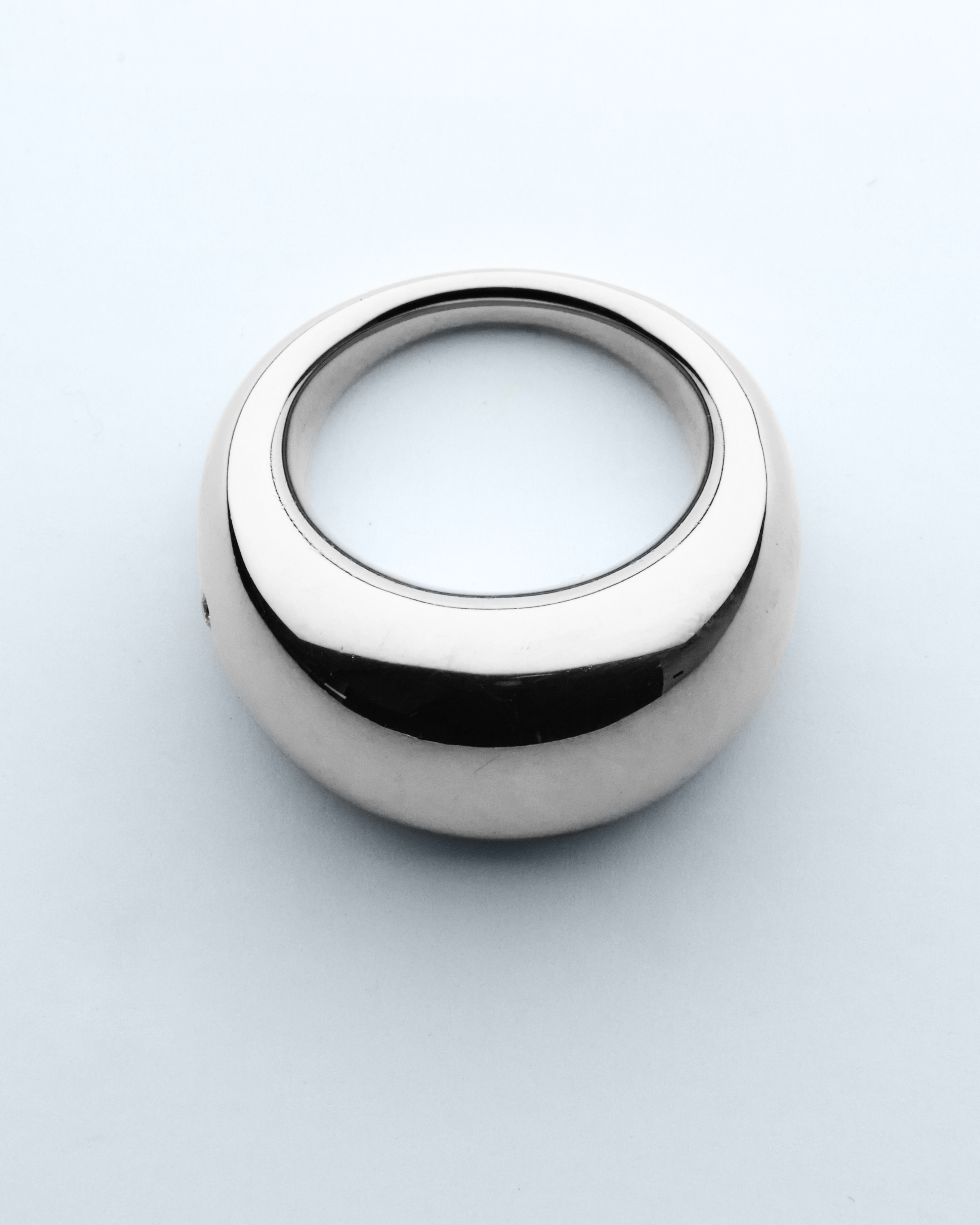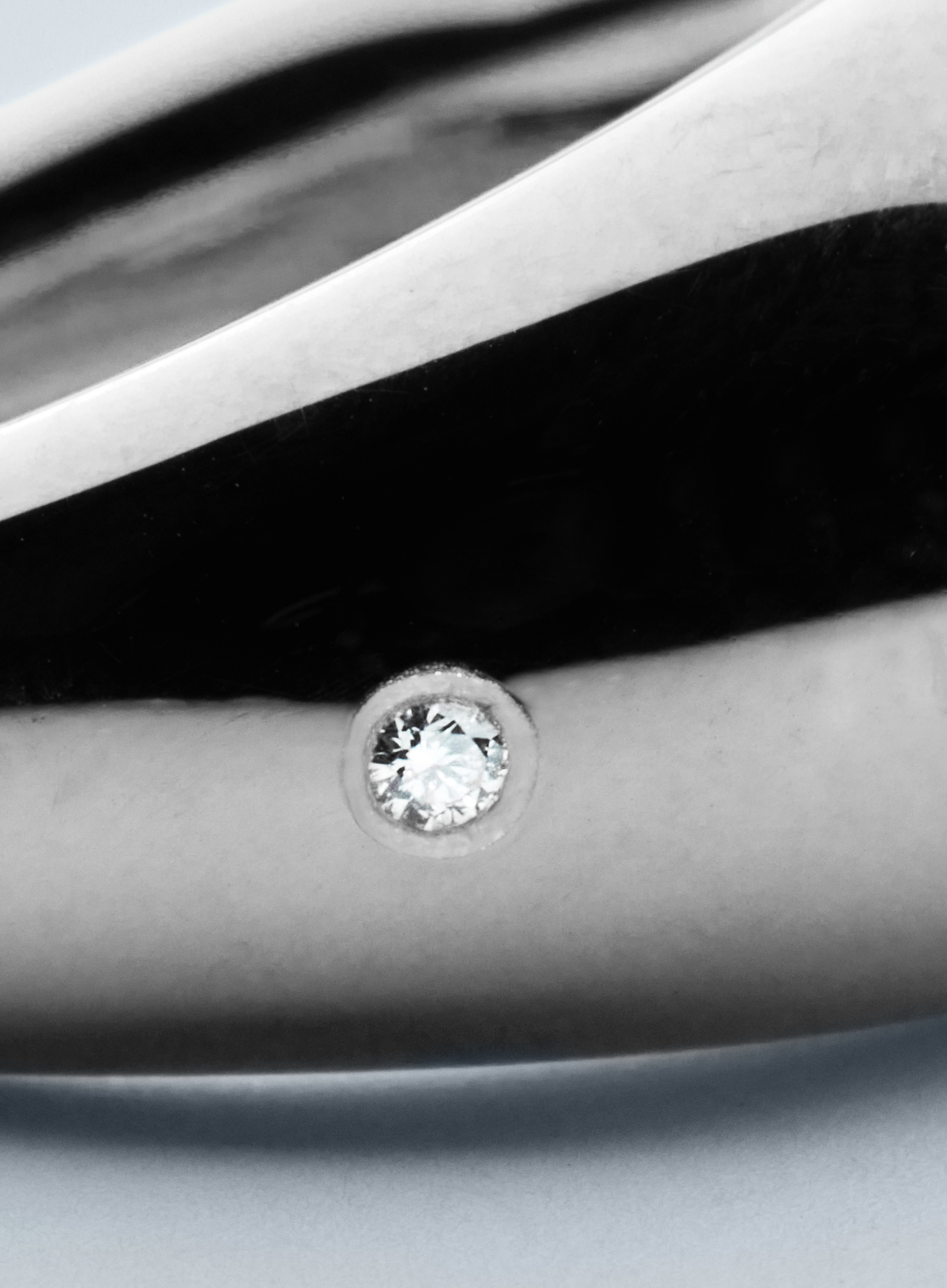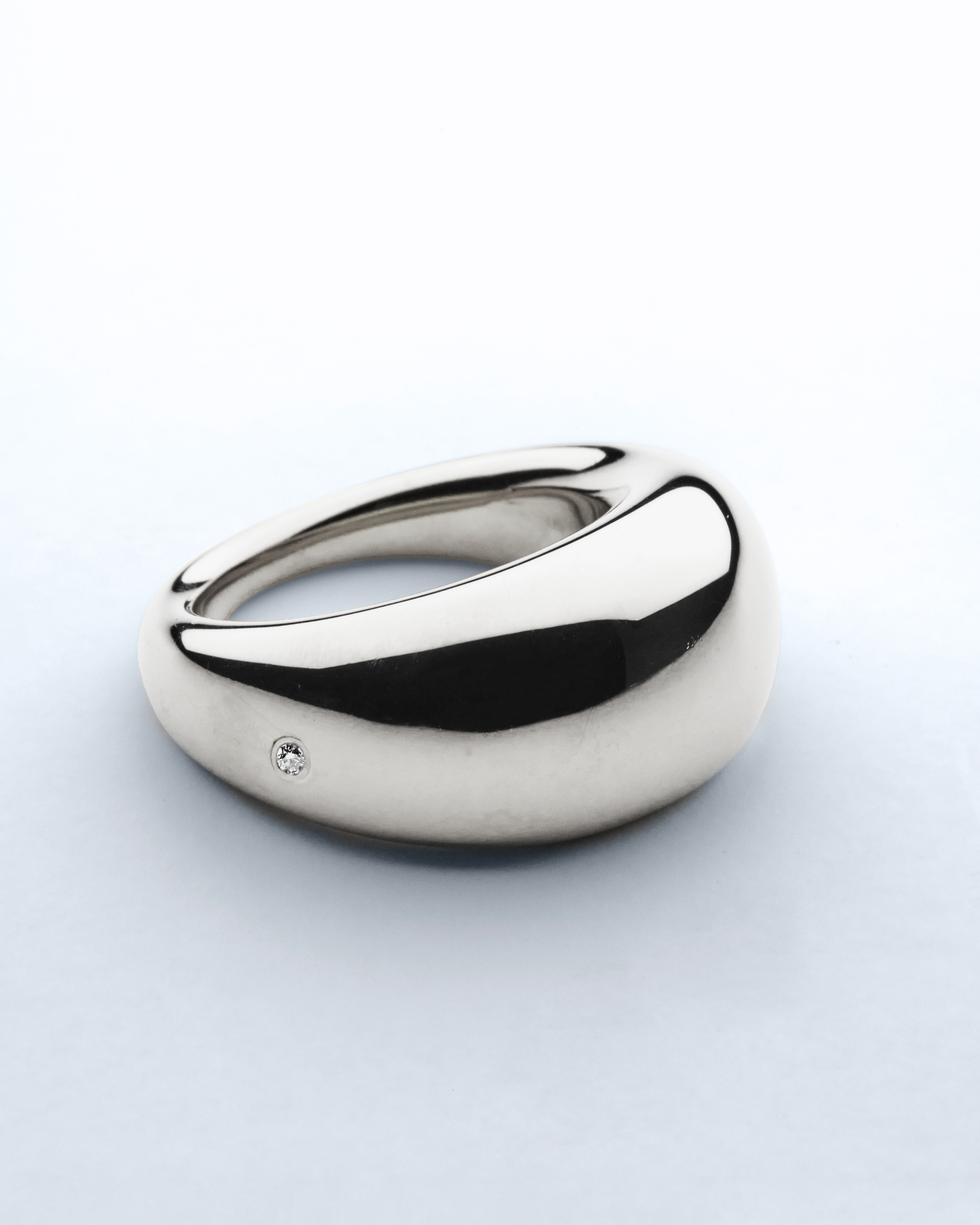 The sterling silver version of The Eduardo Grande Ring is a large 925 sterling silver rhodium-plated piece. It is hand-crafted with the highest attention to detail and embellished with a brilliant-cut diamond. Taking its name from our great-grandmother's surname and Edwardian bombé ring, this jewel is our boldest statement piece. Designed to stack with other bombé shapes or to be worn as a single piece.